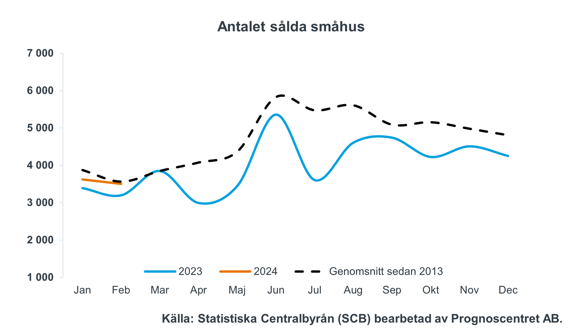 Antalet försäljningar av småhus uppgick i januari till 3 500 vilket utgör en ökning med 10 procent jämfört med samma månad föregående år, och en minskning med 3 procent jämfört med januari. Antalet försäljningar för månaden ligger i linje med det historiska tioårsgenomsnittet för månaden (3 600).