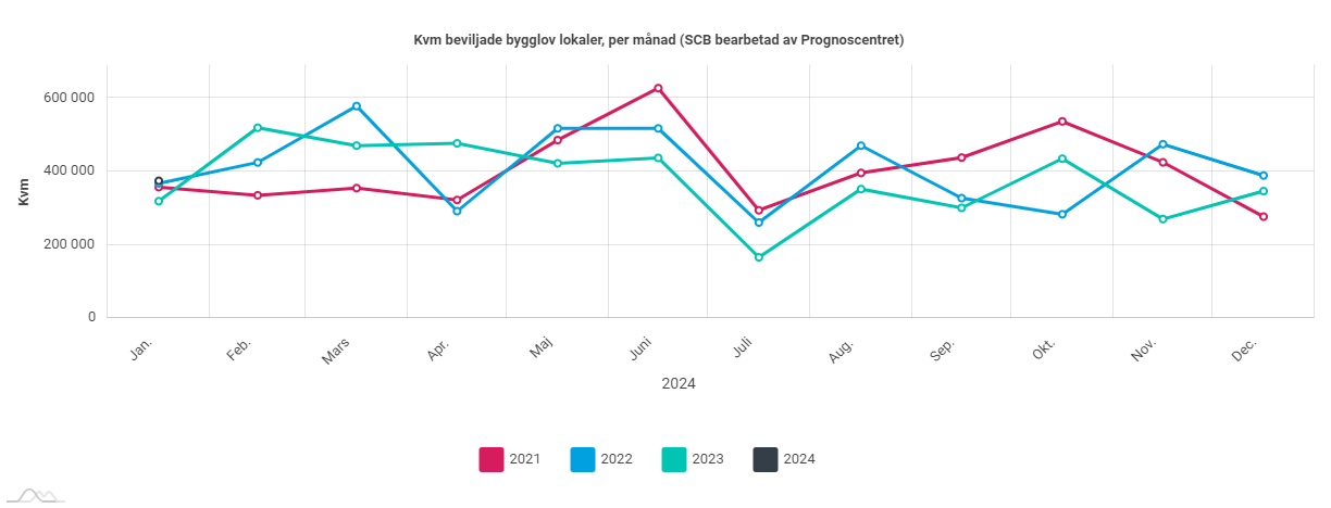 I januari beviljades en areal om totalt 375 000 kvadratmeter lokaler, en ökning med 17 procent eller 55 000 kvadratmeter jämfört med föregående år.