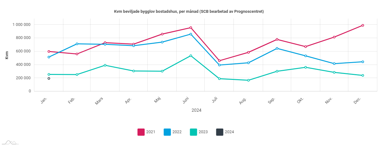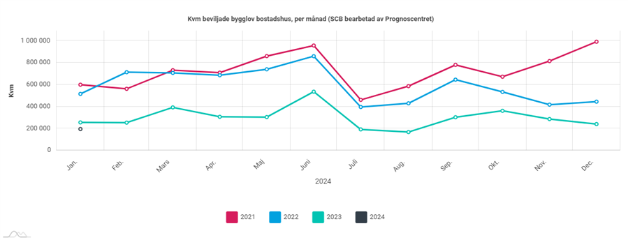 Beviljade bygglov för bostadshus (inkl. fritidshus) uppgick i januari till omkring 195 000 kvadratmeter, vilket är 24 procent eller 60 000 kvadratmeter lägre än i januari 2023.