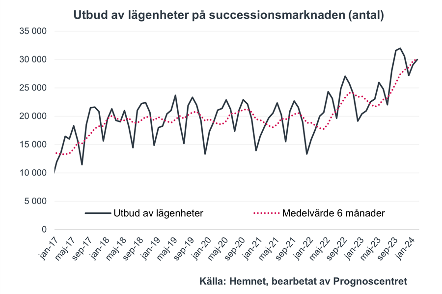 Hemnets statistik för successionsmarknaden avseende februari, vilket inkluderar såväl bostäder till salu samt kommande objekt, visar att utbudet av lägenheter i februari uppgick till nästan 30 000, vilket är 43 procent högre än fjolåret och 3 procent högre än i januari.
