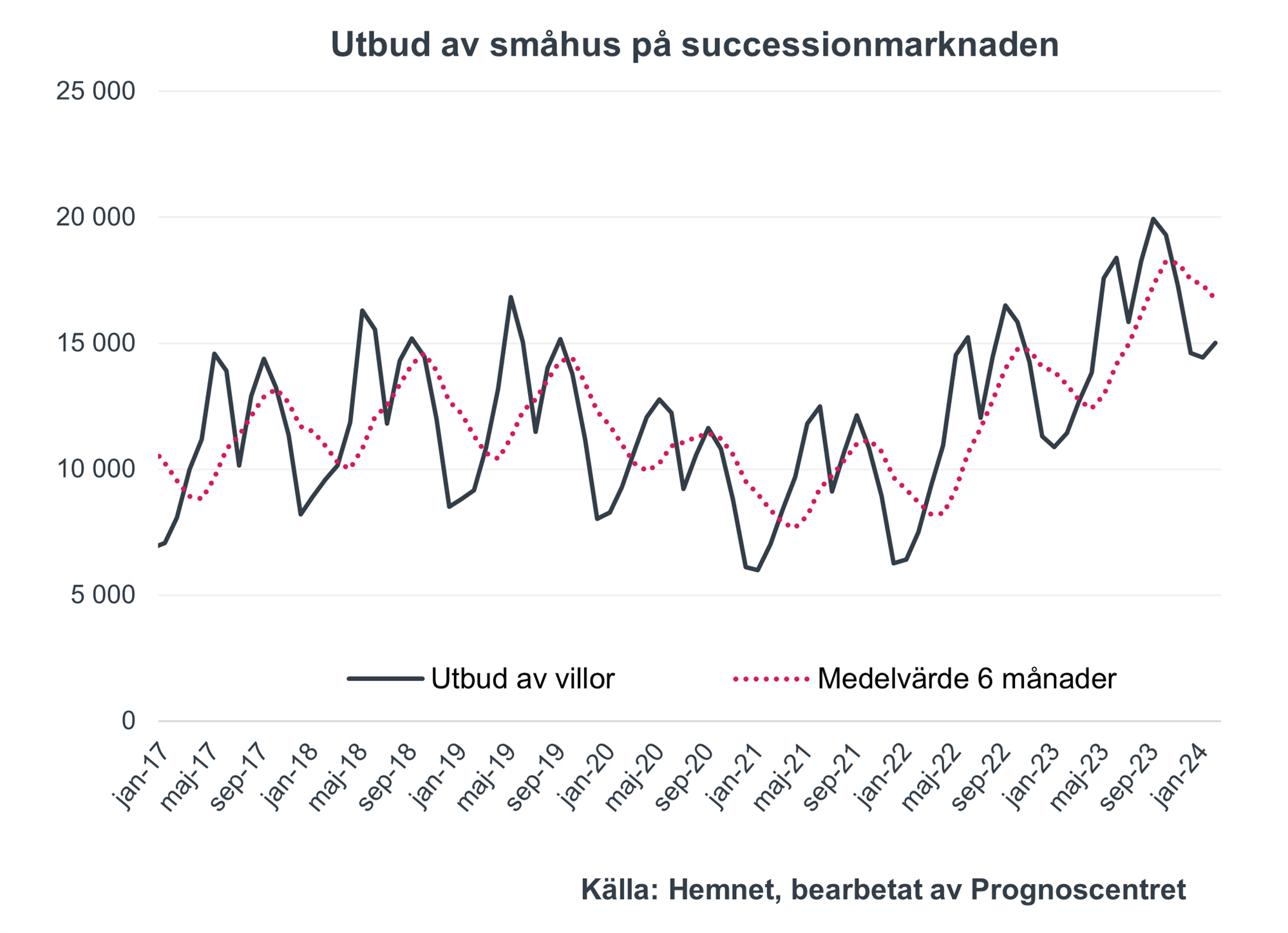 Utbudet av villor på Hemnet uppgick i januari till drygt 15 000, en uppgång med 31 procent jämfört med samma månad i fjol och en uppgång med 4 procent jämfört med i januari.