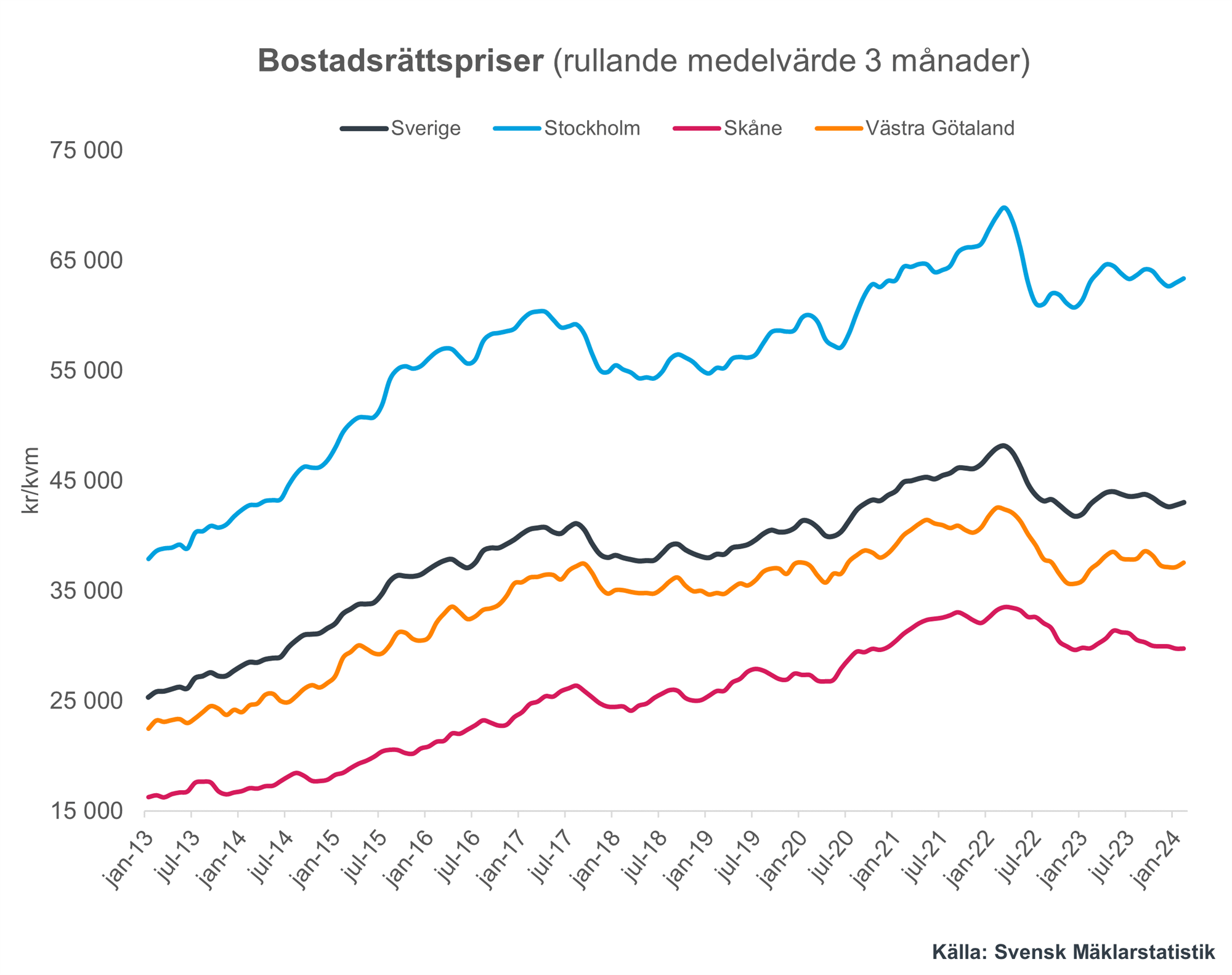 Jämfört med i januari så steg priserna i såväl Stockholmsregionen som i Västra Götaland, med 0,6 resp. 1,1 procent medan de förblev oförändrade i Skåne län. På 12 månader steg priserna med 0,5 procent i Stockholmsregionen och med 1,7 procent i Västra Götaland men i Skåne sjönk priserna marginellt med 0,1 procent.