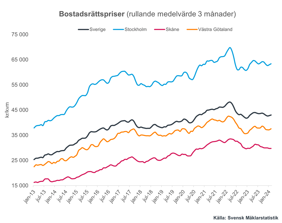 Priserna på bostadsrätter i hela landet steg med 0,6 procent i februari jämfört med månaden innan. På 12 månader är uppgången 0,4 procent.