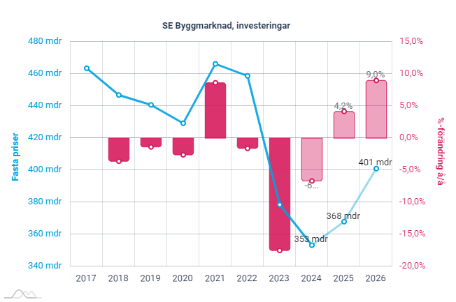 - Efter en nedgång 2023-2024 så sker en ökning från och med nästa år, bland annat till följd av satsningar på energieffektiviseringar. Bristen på kvalificerad arbetskraft utgör dock en osäkerhet som riskerar dämpa investeringstakten.