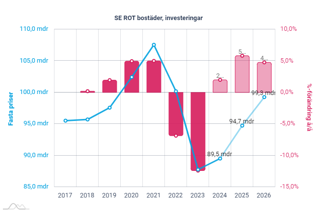 - Enligt den nya prognosen minskar ROT-investeringarna med 0,6 procent i år jämfört med i fjol.