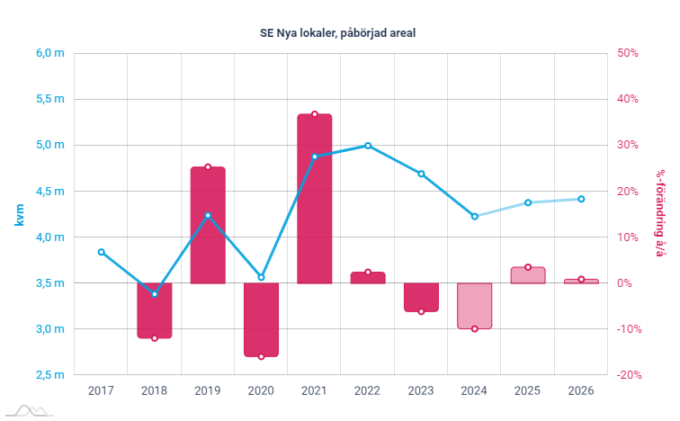 - Efter en liten nedgång för lokalbyggandet 2023-2024 ökar takten 2025 och 2026.