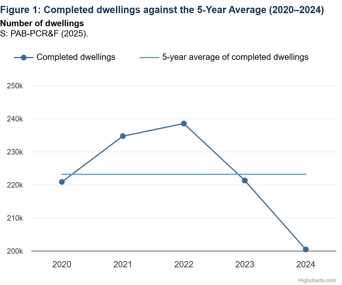 Enligt den polska medlemmen i Euroconstruct Polish Construction Research and Forecasting Institute (PCR&F-PAB) senaste bedömning var bostadsbyggandet under 2024 det lägsta på över fem år, cirka 20 procent lägre jämfört med femårsgenomsnittet.