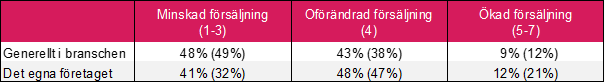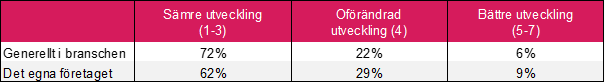 I senaste mätningen tillkom en fråga gällande paneldeltagarnas generella känsla för utvecklingen i branschen och det egna företaget under de kommande tre månaderna. Inte helt oväntat tror majoriteten av de svarande på en sämre utveckling både för det egna företaget och för branschen. Likt de andra frågorna är det något fler som tror att branschen kommer gå sämre än det egna företaget. Trots det rådande läget tror 9 procent av de svarande på en bättre utveckling i det egna företaget.