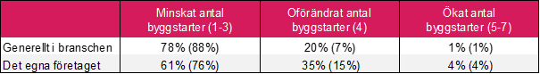 Även när det gäller byggstarter är det fortsatt negativa bedömningar från de svarande. Dock är det färre som angett att de tror att antalet byggstarter kommer minska det kommande kvartalet jämfört med förra mätningen. För branschen totalt sett tror nu närmare åtta av tio att antalet byggstarter kommer att minska i fjärde kvartalet, vid förra mätningen var motsvarande antal närmare nio av tio. Precis som för försäljningstakten är de svarande mindre negativa kring byggstarterna i det egna företagen än branschen generellt. När det gäller det egna företaget anger sex av tio att de tror att antalet byggstarter kommer att minska det kommande kvartalet. Vid förra mätningen var det åtta av tio som trodde på en minskning.