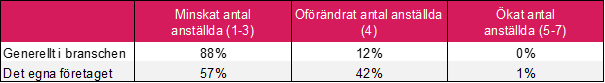 För att få ett längre tidsperspektiv när det gäller utvecklingen av antalet anställda i företaget och branschen är frågeställningen om antalet anställda ändrad sen förra mätningen. Tidigare gjordes bedömningen om det närmsta kvartalet. Nu ställs frågan i stället om de kommande sex månaderna. Även denna fråga är de svarande mer optimistiska när det gäller det egna företaget jämfört med branschen som helhet. Drygt fyra av tio tror inte på några förändringar när det gäller antalet anställda i det egna företaget de kommande sex månaderna. Motsvarande siffra för branschen är drygt en av tio. 88 procent tror på en minskning av antalet anställda i branschen. Motsvarande värde för det egna företaget är 57 procent.