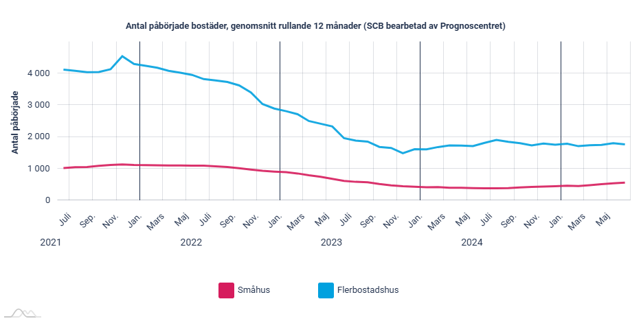 Diagrammet nedan visar antalet påbörjade småhus respektive flerbostadshus beräknat som ett rullande genomsnitt av de senaste 12 månaderna. På det sättet kan trenden i nybyggnationen studeras. Trenden sedan årsskiftet är tydligt positiv för nybyggnationen av småhus medan den är svagt positiv för flerbostadshus. Påbörjandet för både småhus och flerbostadshus befinner sig dock fortsatt på låga nivåer sett ur ett historiskt perspektiv.