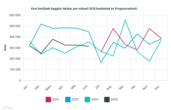 Påbörjade kontorsbyggnader uppgick till knappt 170 000 kvm under första halvåret 2025, ungefär samma nivå som under första halvåret ifjol men lägre än det historiska genomsnittet. Påbörjade affärsbyggnader uppgick till cirka 100 000 kvm under första halvåret vilket var en något högre nivå jämfört med motsvarande perioden under 2023 och 2024, det beror delvis på några stora projekt som har påbörjats under 2025.