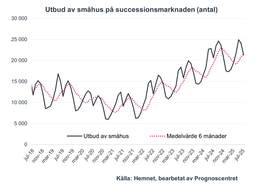 Hemnets statistik för successionsmarknaden vilket inkluderar såväl bostäder till salu samt kommande objekt visar att utbudet av lägenheter i juli uppgick till 34 880, vilket är 18 procent högre än året innan men 9 procent lägre jämfört med juni. Ända sedan sommaren 2022 har utbudet varit högre än det historiska genomsnittet och denna trend accelererade under hösten 2023. Under början av 2025 har det ovanligt höga utbudet vuxit än mer och passerade i maj 40 000 lägenheter för att i juni sjunka tillbaka något.