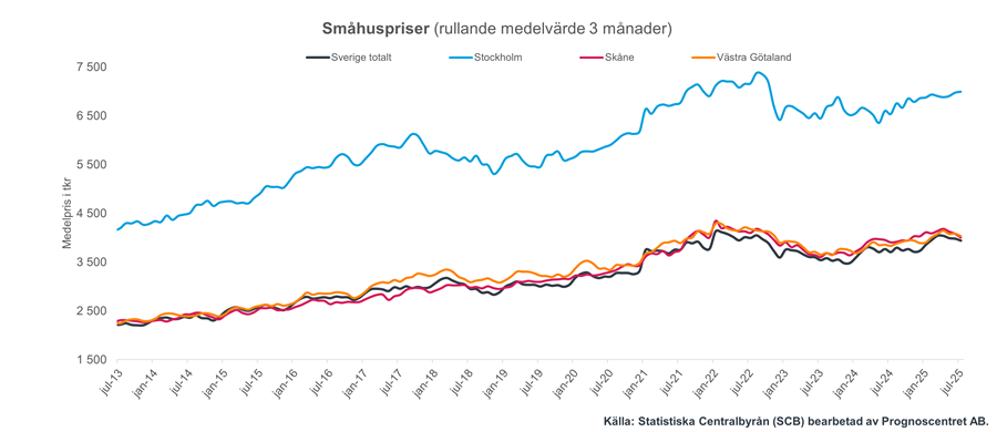 Ser vi till prisutvecklingen under juli 2025 jämfört med juli 2024 i de olika storstadsregionerna så minskade priserna i Västra Götaland med 2,3 procent, steg i Skåne med 3,1 procent men minskade i Stockholm med 1,4 procent. Motsvarande siffror vid jämförelse med månaden innan är för Västra Götaland en nedgång med 1,7 procent, för Skåne en uppgång med 0,7 procent och till sist Stockholm en nedgång med 2,8 procent.