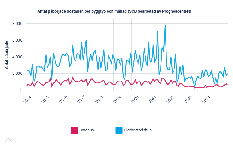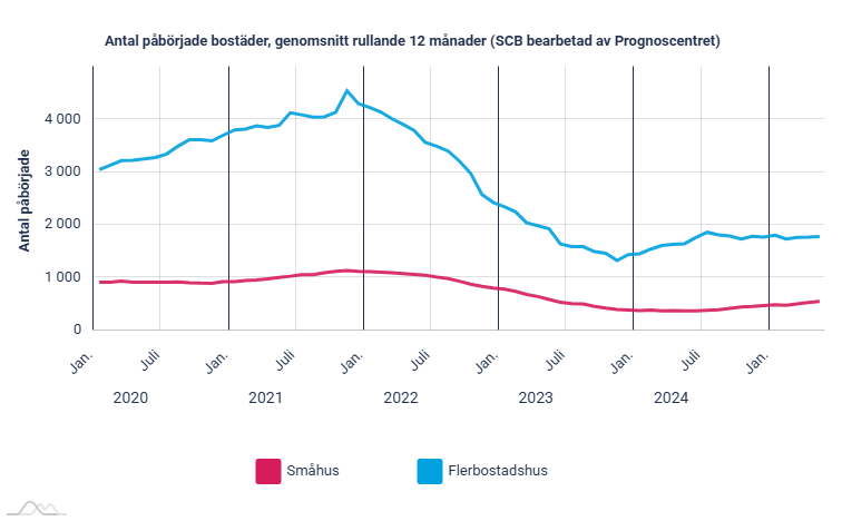 Diagrammet nedan visar antalet påbörjade småhus respektive flerbostadshus beräknat som ett rullande genomsnitt av de senaste 12 månaderna. På det sättet kan trenden i nybyggnationen studeras. Trenden är just nu tydligt positiv för nybyggnationen av småhus medan den är svagt positiv för flerbostadshus. Påbörjandet för både småhus och flerbostadshus befinner sig dock fortsatt på låga nivåer sett ur ett historiskt perspektiv.