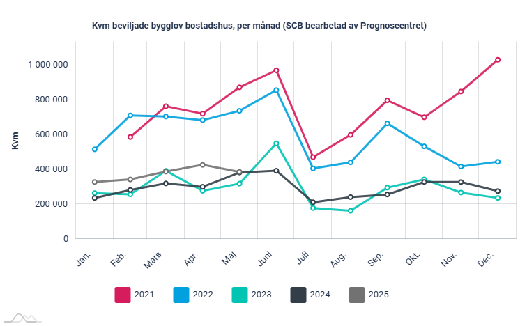 Den senaste byggstatistiken omfattar maj och visar att det totala antalet påbörjade bostäder uppgick till cirka 2 600, en ökning med 18 procent jämfört med maj 2024. Månadsstatistiken fluktuerar mycket men jämförs bostadsbyggandet hittills i år (jan-maj 2025) med motsvarande period för ett år sedan (jan-maj 2024) så har ökningen inte varit lika stor då antalet påbörjade bostäder ökade med 9 procent eller cirka 1100 stycken.
