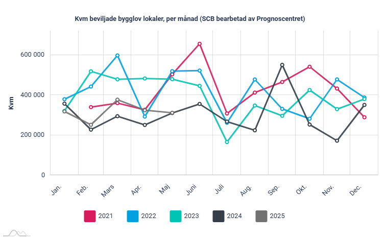 I maj beviljades en areal om drygt 310 000 kvadratmeter lokaler, en ökning med knappt 1 procent eller drygt 1 000 kvadratmeter jämfört med maj ifjol. Under helåret 2024 uppgick beviljade bygglov till drygt 3 617 000 kvadratmeter, vilket var en minskning med knappt 23 procent jämfört med de dryga 4 675 000 kvadratmeter som beviljades under 2023.