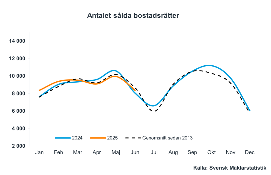 Antalet sålda bostadsrätter i juni 2025 landade på knappt 8 400, vilket är 4 procent fler än juni 2024 men 16 procent färre än föregående månad. Antalet är något färre än den genomsnittliga nivån för månaden sedan 2013 (8 680).