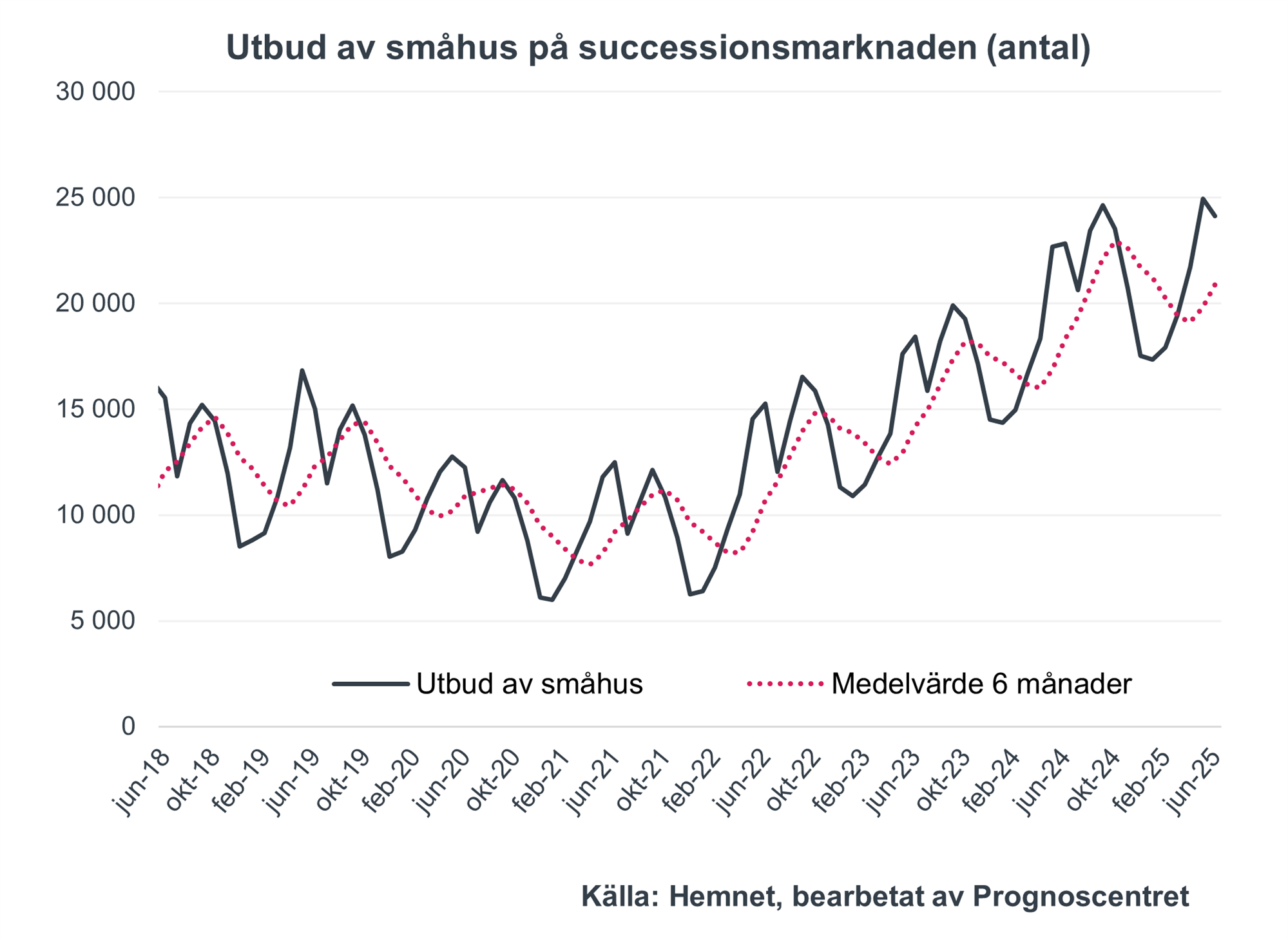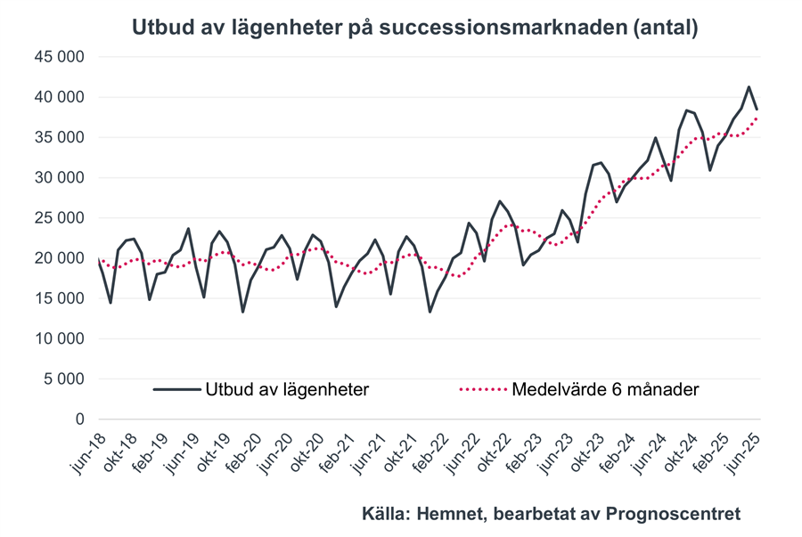 Hemnets statistik för successionsmarknaden vilket inkluderar såväl bostäder till salu samt kommande objekt visar att utbudet av lägenheter i juni uppgick till knappt 38 490, vilket är 20 procent högre än året innan men 7 procent lägre jämfört med maj. Ända sedan sommaren 2022 har utbudet varit högre än det historiska genomsnittet och denna trend accelererade under hösten 2023. Under början av 2025 har det ovanligt höga utbudet vuxit än mer och passerade i maj 40 000 lägenheter för att i juni sjunka tillbaka något.