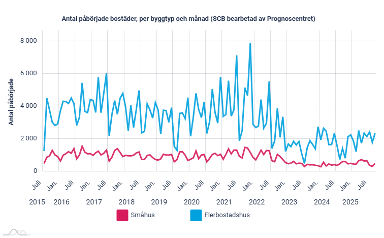 Den senaste byggstatistiken omfattar september och visar att det totala antalet påbörjade bostäder uppgick till cirka 2 800, en ökning med cirka 40 procent jämfört med september 2024. Månadsstatistiken fluktuerar mycket men jämförs bostadsbyggandet hittills i år (jan-sept 2025) med motsvarande period för ett år sedan (jan-sept 2024) så har antalet påbörjade bostäder ökat med 14 procent eller cirka 2 800 stycken.