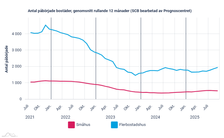 Diagrammet nedan visar antalet påbörjade småhus respektive flerbostadshus beräknat som ett rullande genomsnitt av de senaste 12 månaderna. På det sättet kan trenden i nybyggnationen studeras. Trenden sedan årsskiftet fram till juni var positiv för nybyggnationen av både småhus och flerbostadshus. När statistiken för tredje kvartalet har tillkommit ser det ut som byggnationen av lägenheter går lite starkare än trenden medan det är lite mer osäkert vad som gäller för småhus. Byggnationen av småhus tappade enligt statistiken fart i augusti och september men det kan mycket väl vara en effekt av eftersläpningen i insamlingen av data under sensommaren. Det är därför för tidigt att tala om ett trendbrott i småhusbyggandet även fast kurvan för småhus i diagrammet nedan har planat ut i den den senaste mätningen.  Påbörjandet för både småhus och flerbostadshus befinner sig dock fortsatt på låga nivåer sett ur ett historiskt perspektiv.
