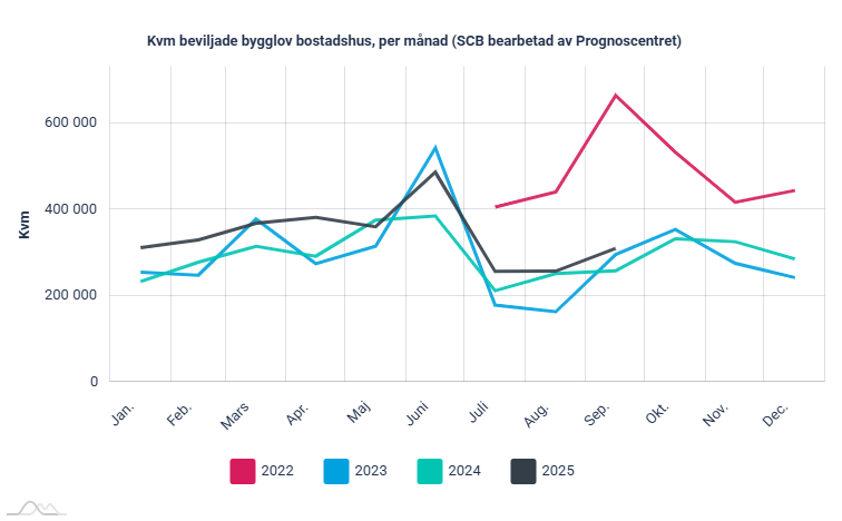 Den senaste statistiken för byggstarter och beviljade bygglov omfattar september 2025. Den hämtas från SCB och bearbetas sedan av Prognoscentret för bland annat eftersläpning i den inrapporterade statistiken.