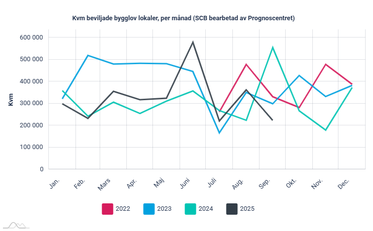 I september beviljades en areal om drygt 220 000 kvadratmeter lokaler, en minskning med cirka 60 procent eller cirka 330 000 kvadratmeter jämfört med september ifjol. Under helåret 2024 uppgick beviljade bygglov till knappt 3 700 000 kvadratmeter, vilket var en minskning med drygt 21 procent jämfört med de dryga 4 690 000 kvadratmeter som beviljades under 2023.