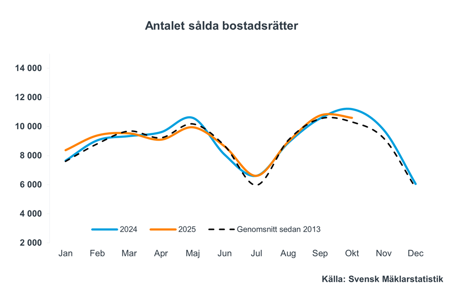 Antalet sålda bostadsrätter i oktober 2025 uppgick till drygt 10 600, vilket är cirka 300 fler jämfört med den genomsnittliga nivån för månaden sedan 2013 (10 317).