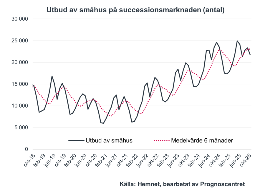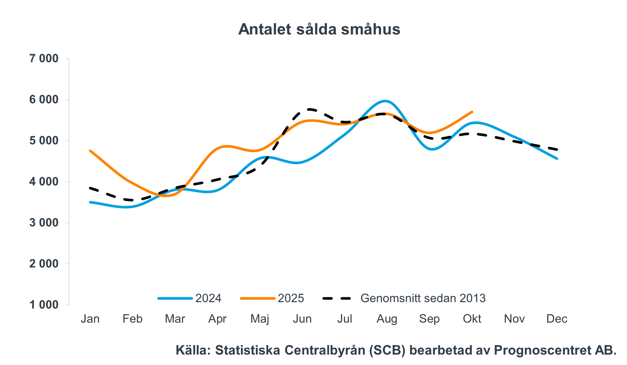 Under oktober 2025 visar skattningen att det såldes cirka 5 700 småhus, en ökning med cirka 5 procent jämfört med oktober ifjol. Den genomsnittliga nivån för oktober sedan 2013 är lägre och uppgår till 5 168 sålda småhus. SCB samlar in månadsdata avseende lagfarter (inte kontraktsskrivning) som är preliminär och behäftad med osäkerhet (lagfarten beviljas vanligvis 1-3 månader efter kontraksskrivning). Prognoscentret räknar upp månadsnoteringarna cirka ett år bakåt för eftersläpning i SCB:s statistik. Mätningen för den senaste månaden (denna gång oktober) är väldigt osäker och bortfallet är stort, därför blir även den uppräknade siffran väldigt osäker.