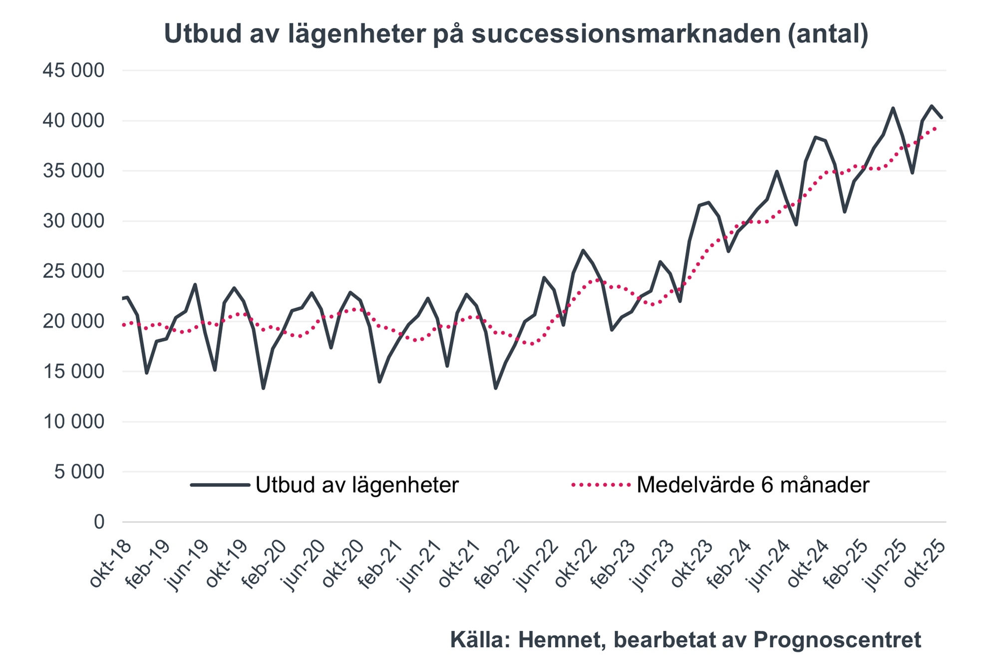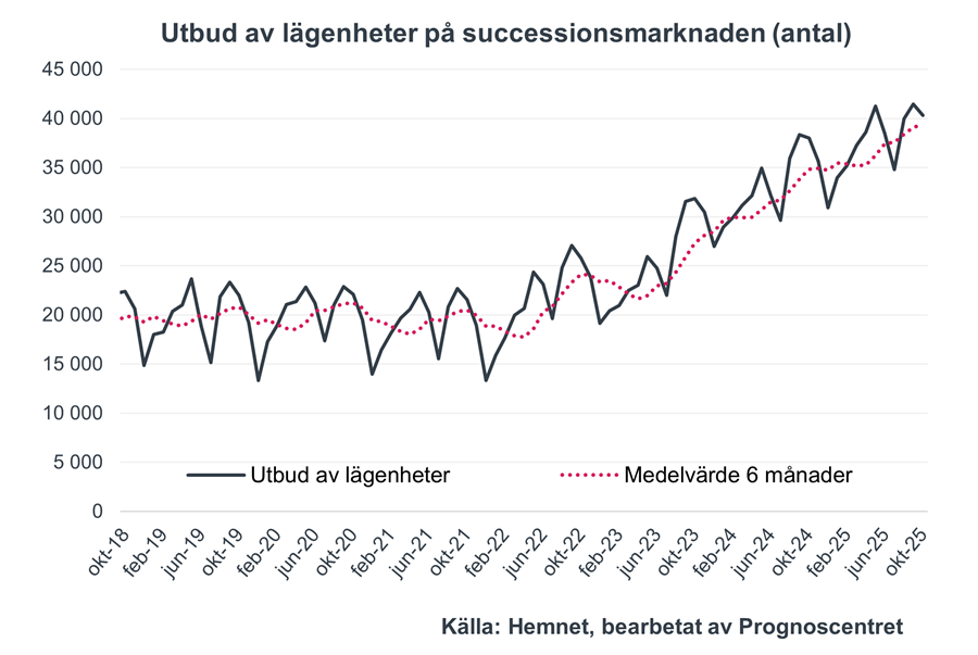 Hemnets statistik för successionsmarknaden vilket inkluderar såväl bostäder till salu samt kommande objekt visar att utbudet av lägenheter i oktober uppgick till drygt 40 300, vilket är 6 procent högre än året innan men 3 procent lägre jämfört med september. Ända sedan sommaren 2022 har utbudet varit högre än det historiska genomsnittet och denna trend accelererade under hösten 2023. Hittills under 2025 har det ovanligt höga utbudet vuxit än mer och passerade i maj för första gången 40 000 lägenheter.