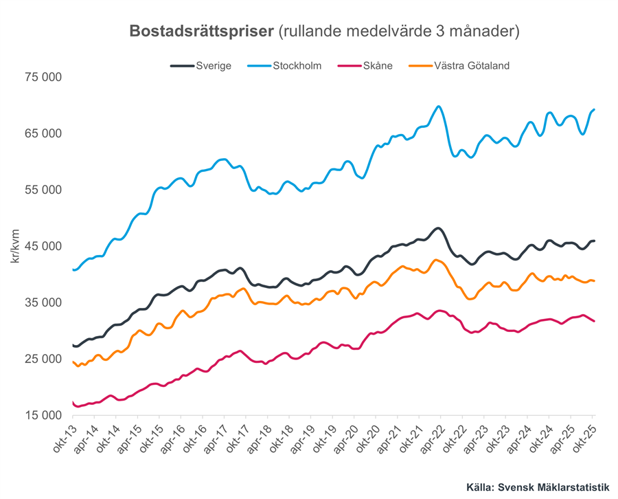 Den senaste statistiken hämtas från Svensk Mäklarstatistik och SCB och omfattar oktober 2025.