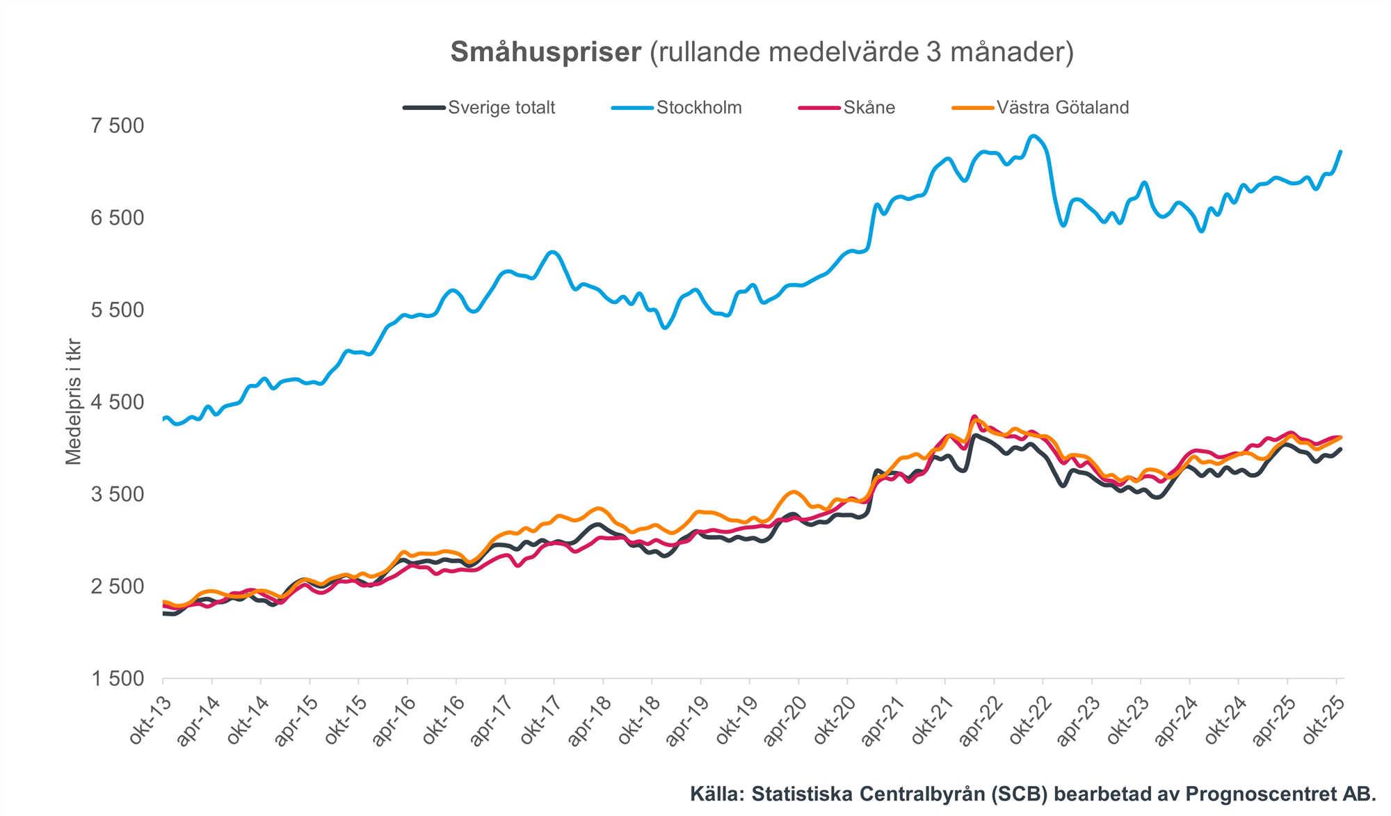 Ser vi till prisutvecklingen under oktober 2025 jämfört med oktober 2024 i de olika storstadsregionerna så minskade priserna i Västra Götaland med 2,0 procent, minskade i Skåne med 1,0 procent men steg i Stockholm med 0,8 procent. Motsvarande siffror vid jämförelse med månaden innan är för Västra Götaland en nedgång med 0,3 procent, för Skåne en nedgång med 1,1 procent och till sist Stockholm en uppgång med 1,0 procent.