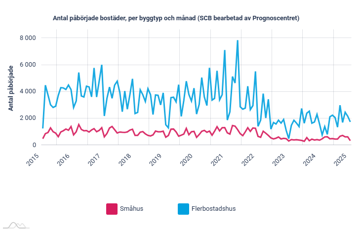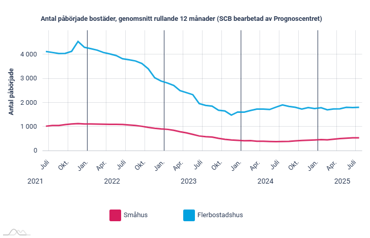 Den senaste byggstatistiken omfattar juli och visar att det totala antalet påbörjade bostäder uppgick till cirka 2 100, en ökning med 7 procent jämfört med juli 2024. Månadsstatistiken fluktuerar mycket men jämförs bostadsbyggandet hittills i år (jan-juli 2025) med motsvarande period för ett år sedan (jan-juli 2024) så har antalet påbörjade bostäder ökat med 10 procent eller cirka 1 700 stycken.