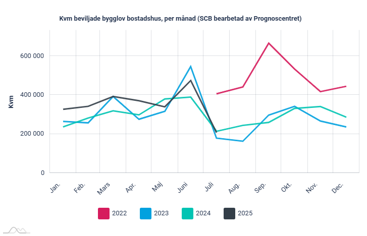 Den senaste statistiken för byggstarter och beviljade bygglov omfattar juli 2025. Den hämtas från SCB och bearbetas sedan av Prognoscentret för bland annat eftersläpning i den inrapporterade statistiken.