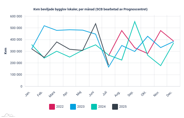 I juli beviljades en areal om drygt 180 000 kvadratmeter lokaler, en minskning med cirka 30 procent eller knappt 100 000 kvadratmeter jämfört med juli ifjol (byggloven för juni har reviderats kraftigt uppåt från drygt 300 000 till drygt 500 000 kvm i den senaste mätningen). Under helåret 2024 uppgick beviljade bygglov till drygt 3 693 000 kvadratmeter, vilket var en minskning med knappt 22 procent jämfört med de dryga 4 702 000 kvadratmeter som beviljades under 2023.