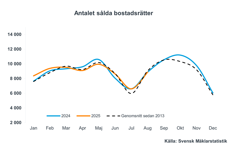 Antalet sålda bostadsrätter i augusti 2025 uppgick till knappt 8 900, vilket är lika många som i augusti 2024 men 35 procent fler än föregående månad (det säljs alltid fler bostadsrätter i augusti jämfört med juli). Antalet är däremot något färre än den genomsnittliga nivån för månaden sedan 2013 (9 060).