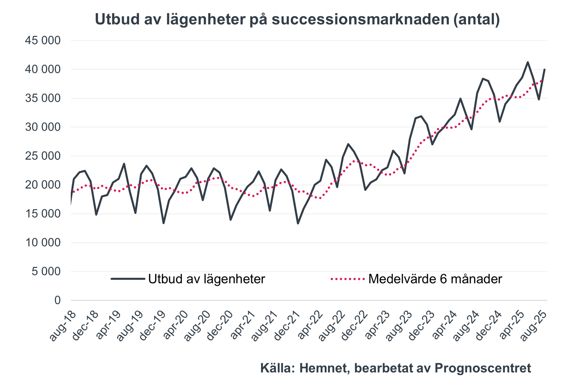 Hemnets statistik för successionsmarknaden vilket inkluderar såväl bostäder till salu samt kommande objekt visar att utbudet av lägenheter i augusti uppgick till knappt 40 000, vilket är 11 procent högre än året innan och 15 procent högre jämfört med juli. Ända sedan sommaren 2022 har utbudet varit högre än det historiska genomsnittet och denna trend accelererade under hösten 2023. Hittills under 2025 har det ovanligt höga utbudet vuxit än mer och passerade i maj för första gången 40 000 lägenheter.