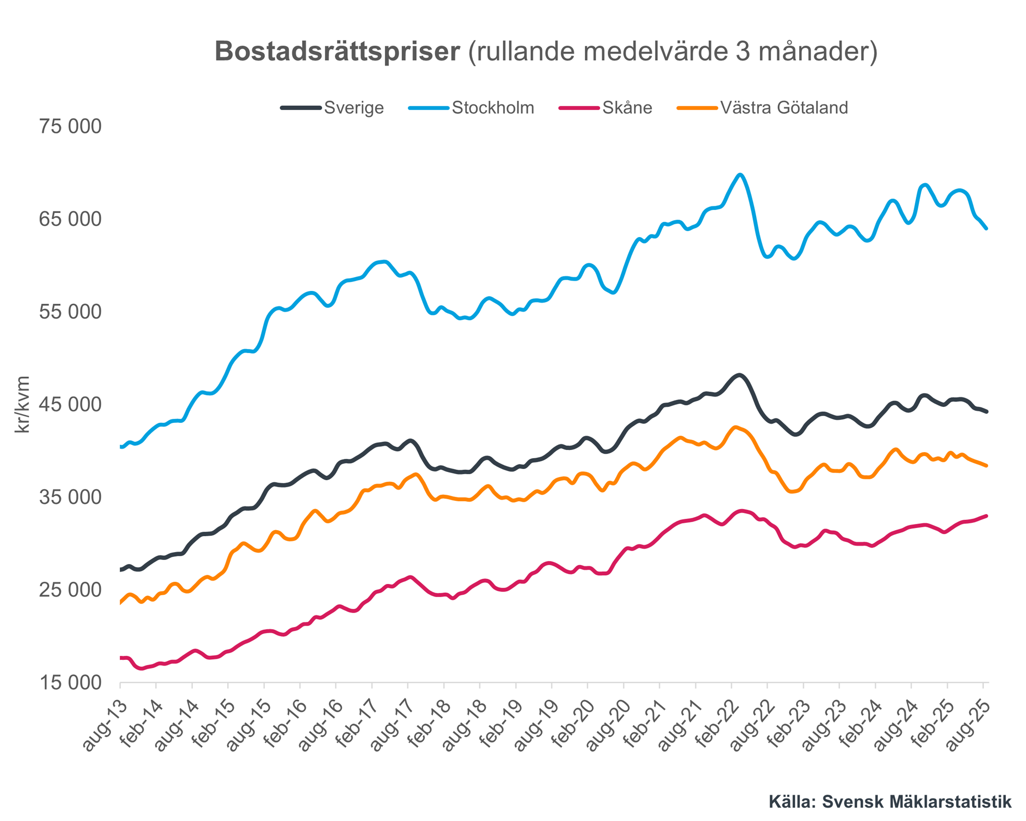 Den senaste statistiken hämtas från Svensk Mäklarstatistik och SCB och omfattar augusti 2025.