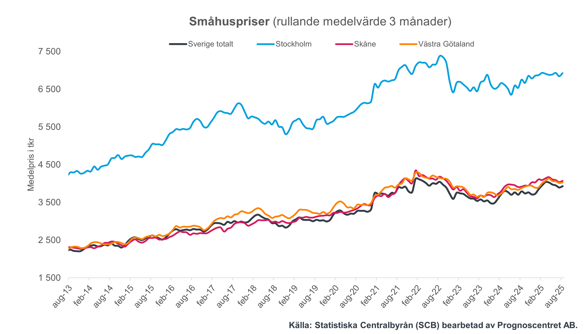 Ser vi till prisutvecklingen under augusti 2025 jämfört med augusti 2024 i de olika storstadsregionerna så minskade priserna i Västra Götaland med 1,1 procent, steg i Skåne med 3,5 procent men minskade i Stockholm med 2,2 procent. Motsvarande siffror vid jämförelse med månaden innan är för Västra Götaland en nedgång med 0,7 procent, för Skåne en uppgång med 0,7 procent och till sist Stockholm en nedgång med 1,3 procent.
