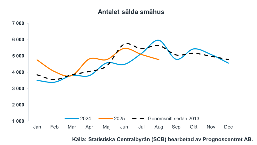Under augusti 2025 visar skattningen att det såldes knappt 4 800 småhus, en minskning med 20 procent jämfört med augusti ifjol. Den genomsnittliga nivån för augusti sedan 2013 är högre och uppgår till 5 640 sålda småhus. SCB samlar in månadsdata avseende lagfarter (inte kontraktsskrivning) som är preliminär och behäftad med osäkerhet (lagfarten beviljas vanligvis 1-3 månader efter kontraksskrivning). Prognoscentret räknar upp månadsnoteringarna cirka ett år bakåt för eftersläpning i SCB:s statistik. Mätningen för den senaste månaden (denna gång augusti) är väldigt osäker och bortfallet är stort, därför blir även den uppräknade siffran väldigt osäker.