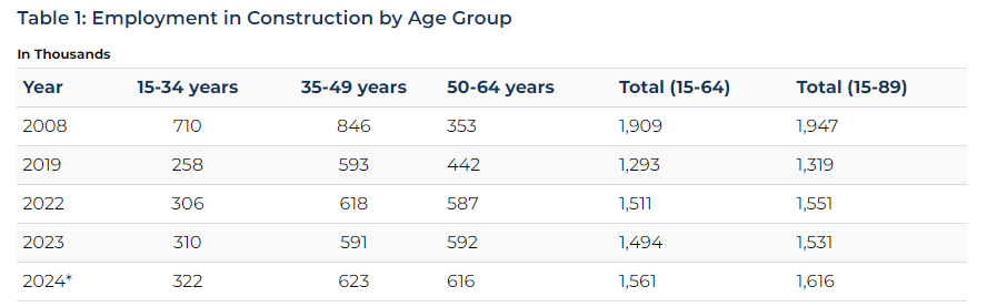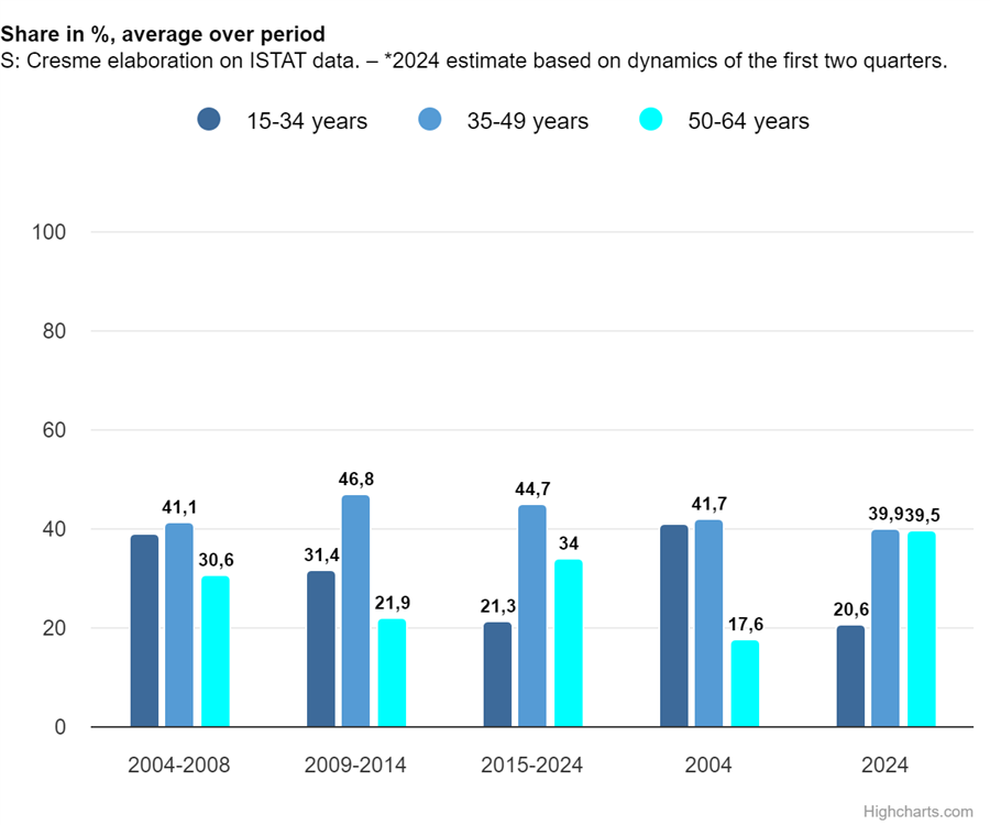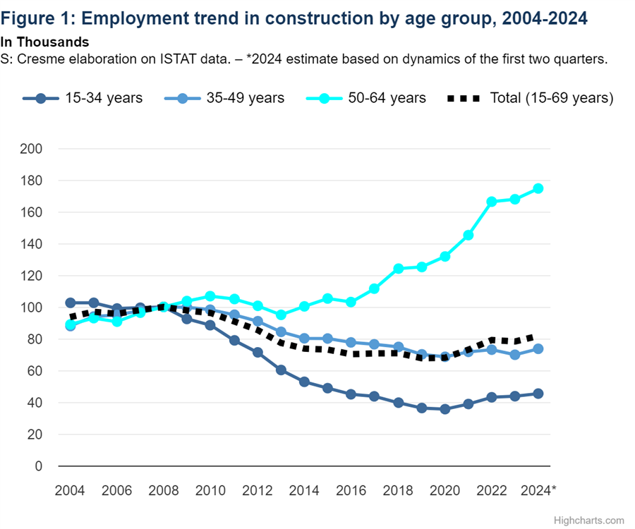 Structural factors also play a role in explaining the divergent dynamics between employment and investments in construction. These include improvements in productive efficiency or the automation of certain activities (where employment declines while investments increase) or the predominance of maintenance and renovation projects, which are more labour-intensive. Additionally, the labour market dynamics are strongly influenced by the age composition of the workforce. This analysis highlights the diminishing appeal of the sector among younger workers. However, recent years suggest a potential shift.