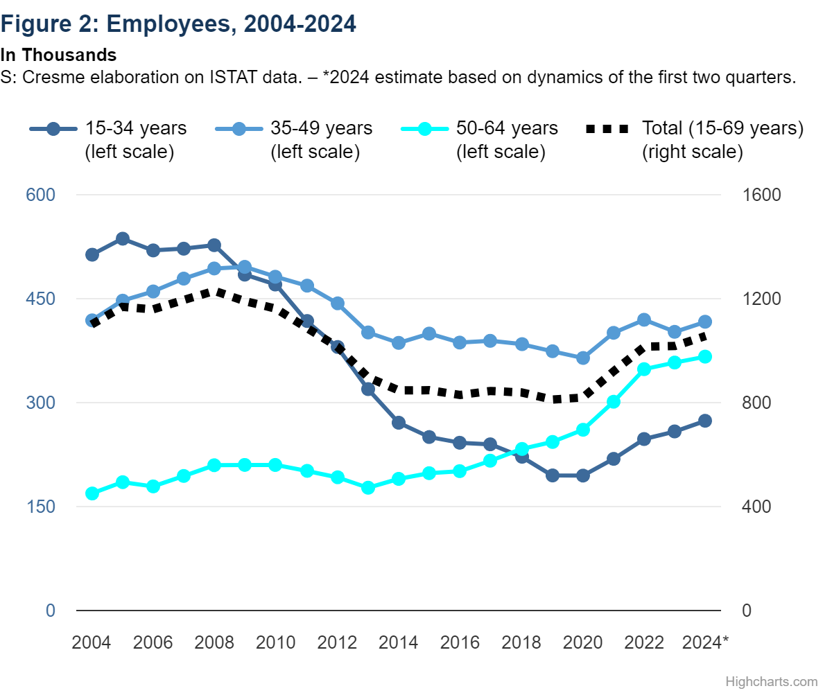 The construction sector has played a key role in employment growth in recent years. Following the robust growth observed in 2021-2022, driven by state incentives for building renovation, the construction sector began to slow down in 2023. The gradual phasing out of incentive policies, such as the “Superbonus 110%”, had a significant impact. According to Labour Force Survey data, the sector lost almost 20,000 workers in 2023 (-1.3%), halting the positive trend of previous years. In contrast, other sectors, such as services (+2.4%) and industry (+2.2%), continued their stable growth. However, in the second quarter of 2024, the sector showed a substantial recovery in employment (+4.5%), outperforming the overall employment growth in the national economy (+1.4%) and the stagnation in industry.