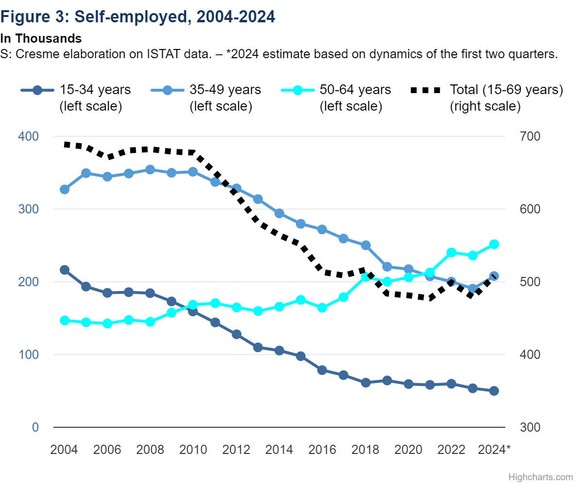 In 2004, workers under 35 accounted for nearly 41% of employment in construction, the same share as those aged 35-49, while less than 18% were over 50. Over the past two decades, younger workers have steadily exited the sector, reaching their lowest level in 2020 (below 20%). However, the share of workers under 50 has not increased, dropping to 45% in 2020 from 49% in 2016. Conversely, the share of older workers (over 50) has doubled from 18% in 2004 to 36% in 2020. Recently, from 2021 to 2024, there has been a renewed interest among younger workers, whose share has risen to 21% of the total. Meanwhile, the 35-49 age group has dropped below 40%, and older workers have reached their highest level of around 40%. Notably, during this period, the share of workers aged 65 and older has increased, from less than 2% in 2004 to 3.4% in 2024. The recent growth in young workers has been concentrated among employees, who grew by 41% between 2020 and 2024, while young self-employed workers decreased by 16%. Similarly, the number of self-employed workers aged 35-49 declined by 4%, while employees in the same age group grew by 14%. Among older workers, employment expanded across the board, with a 41% increase in employees and a 22% rise in self-employed workers between 2020 and 2024.