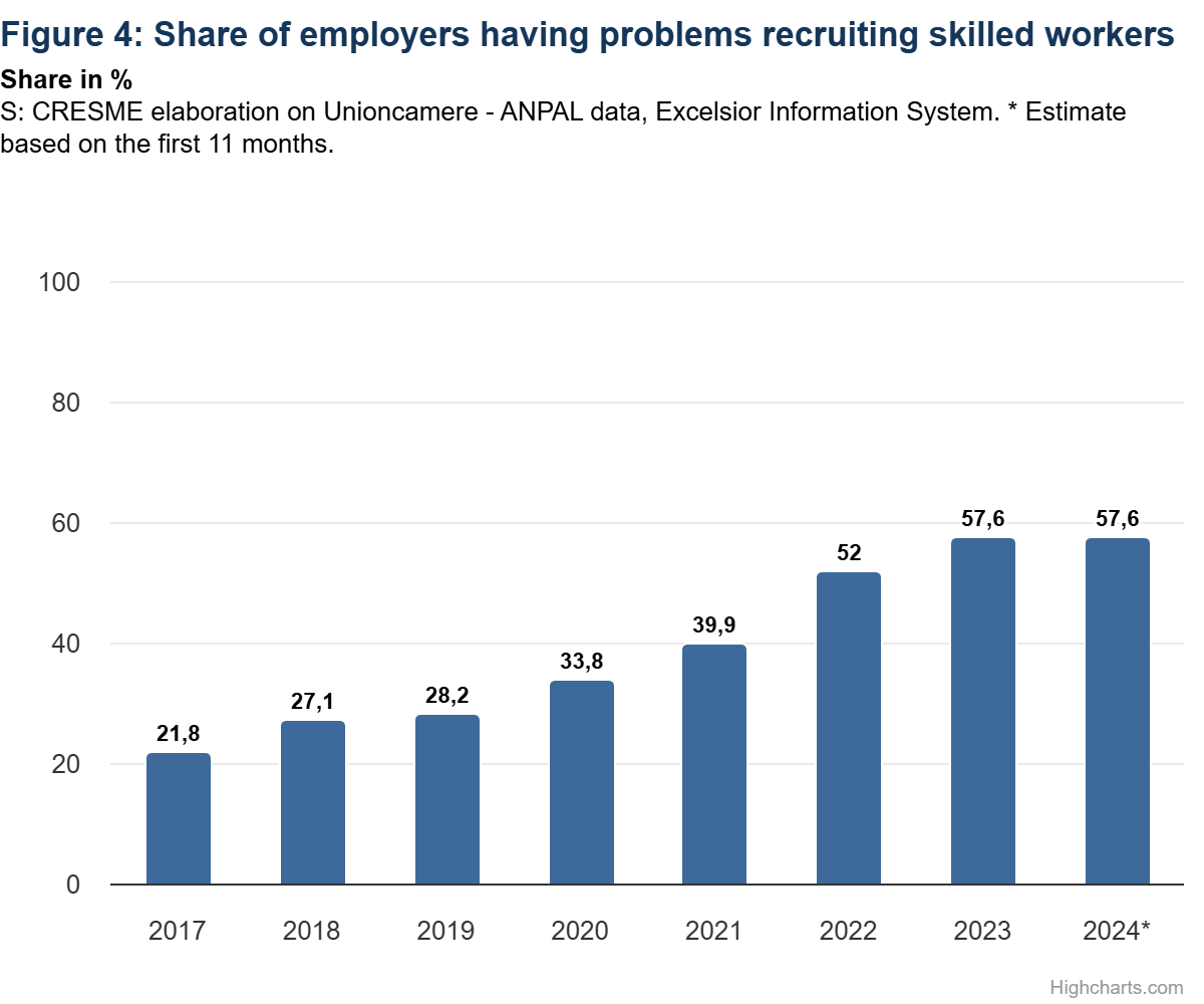 Future hiring trends. The demand for new hires in the construction sector, as surveyed by Unioncamere, has shown a growing trend from 2017 to 2023, interrupted only by the pandemic. Hires increased from over 358,000 in 2017 to nearly 250,000 in 2023, with an estimated 554,000 hires projected based on the first 11 months of the current year. Alongside this growth, the difficulty in finding workers has risen sharply, from less than 22% in 2017 to nearly 58% in recent years. This challenge has been attributed primarily to a reduced number of candidates (58%-61% in the last two years) rather than a lack of qualifications, which was more prominent in earlier years.