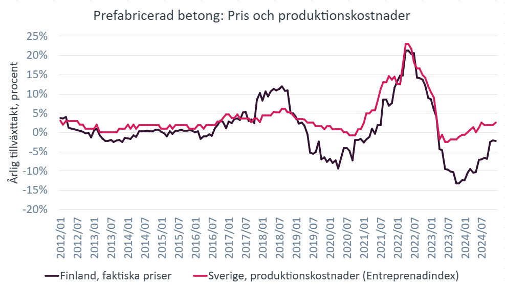I Sverige saknas officiell statistik över försäljningspriset på betongelement, men i Finland finns sådan data tillgänglig, vilket kan ge en indikation på trenderna även här. Den kraftiga nedgången i nybyggnation i Finland har lett till att försäljningspriserna på betongelement sjunkit mer än kostnaden för insatsvarorna. Detta har resulterat i en stor skillnad mellan den rådande prisnivån på betongelement och produktionskostnaderna – en utveckling som troligtvis även gäller för den svenska marknaden.