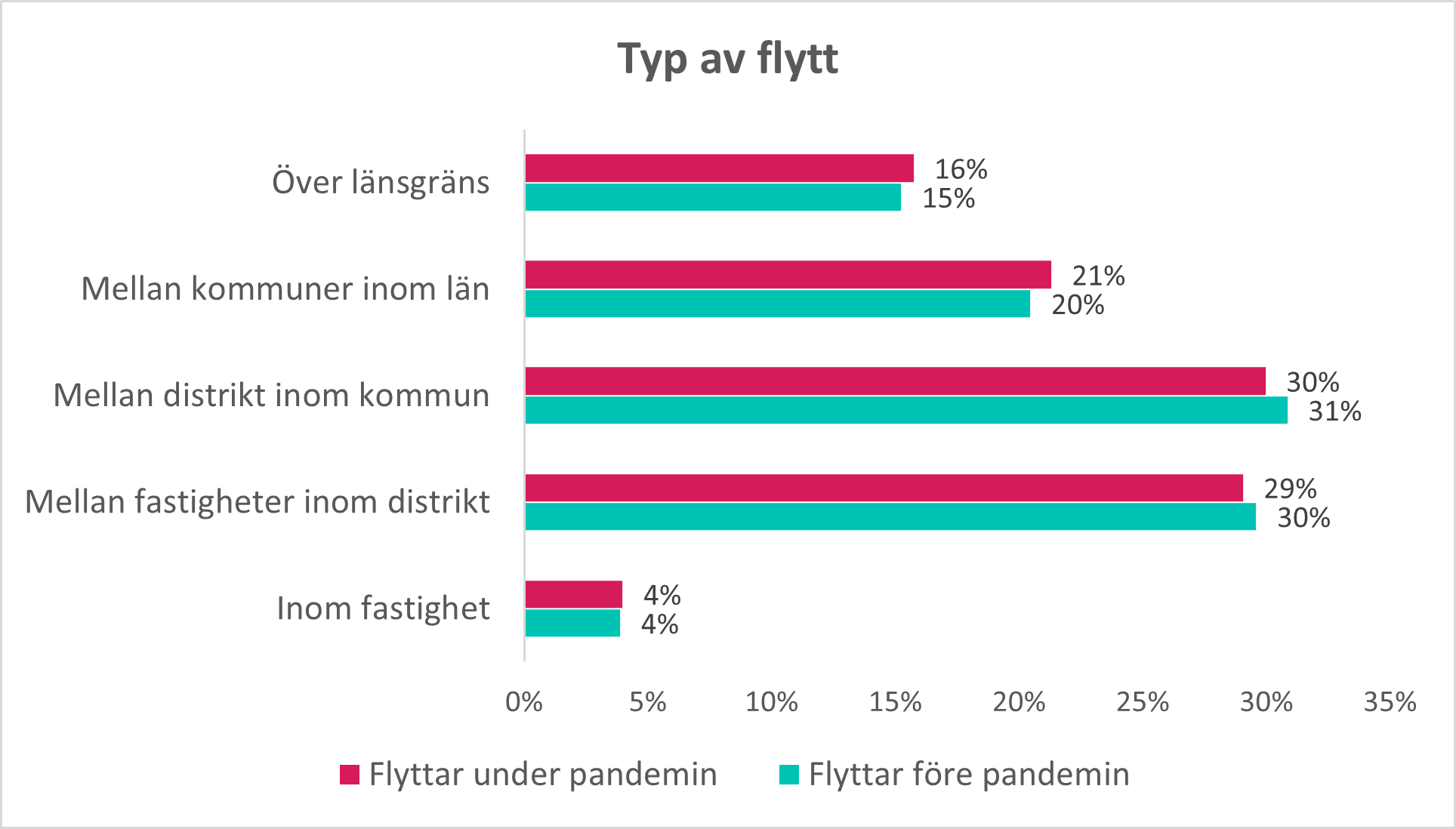 Ja, faktum är att man faktiskt kan notera en viss förändring även om den inte är särskilt stor. Fortfarande inträffade ungefär var tredje flytt inom en fastighet eller mellan fastigheter inom ett distrikt. Under pandemin ökade dock andelen flyttar mellan kommuner från 35 till 37 procent. Det finns alltså en tendens till att i större utsträckning än tidigare byta kommun.