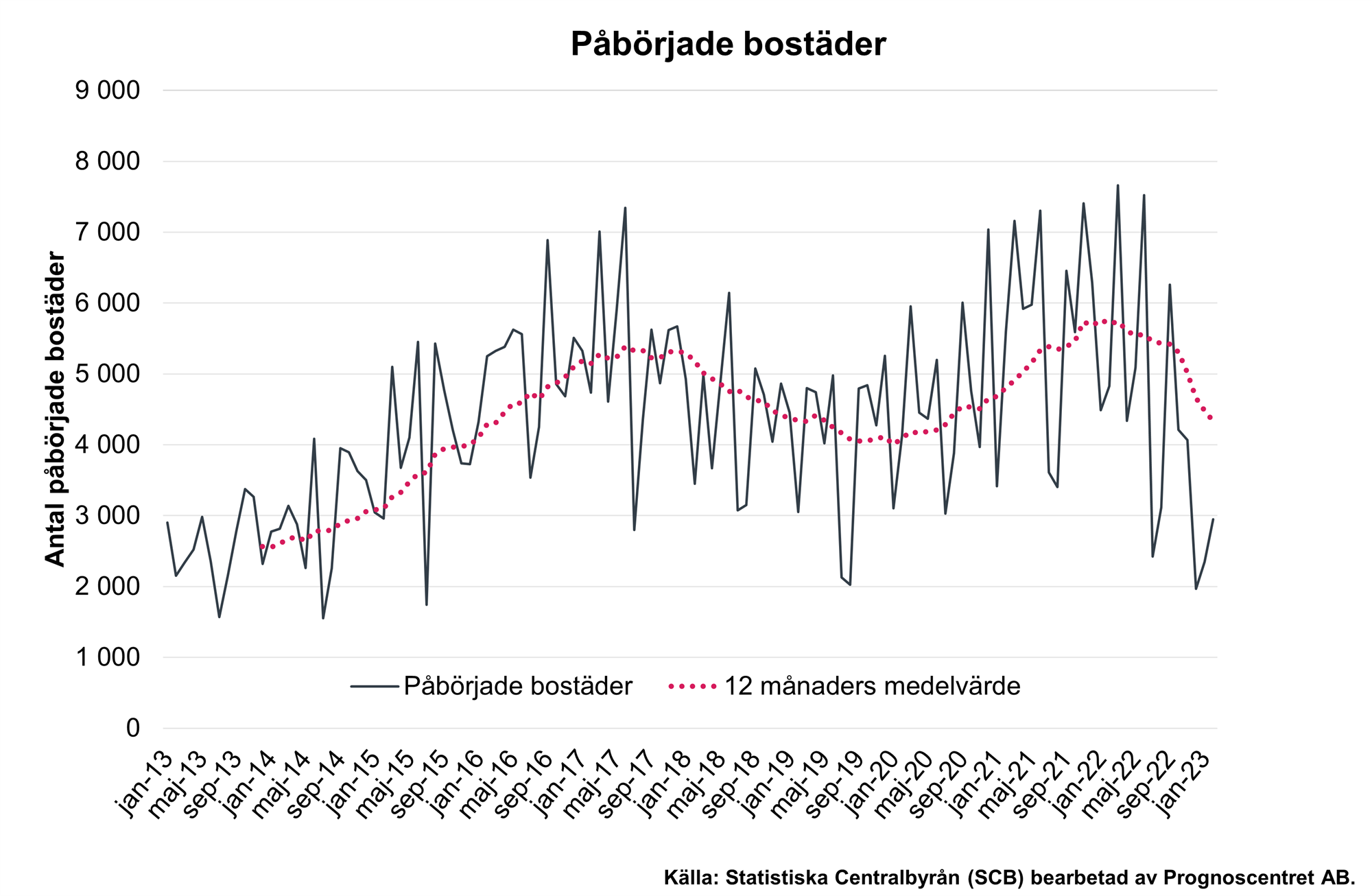 Den senaste byggstatistiken omfattar februari månad och visar på en fortsatt kraftig nedgång i bostadsbyggandet. Antalet påbörjade bostäder uppgick totalt till strax under 3 000 vilket motsvarar en minskning med nära 40 procent jämfört med samma månad förra året.