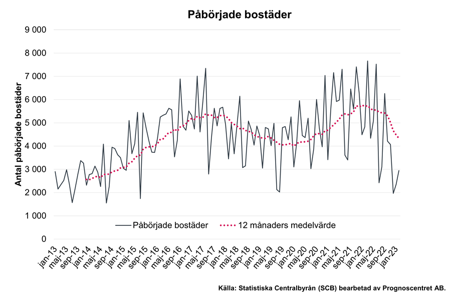 Antalet påbörjade flerbostadshus uppgick under månaden till 2 300 och antalet småhus till cirka 650 vilket är en minskning med 38 resp. 42 procent jämfört med i fjol.