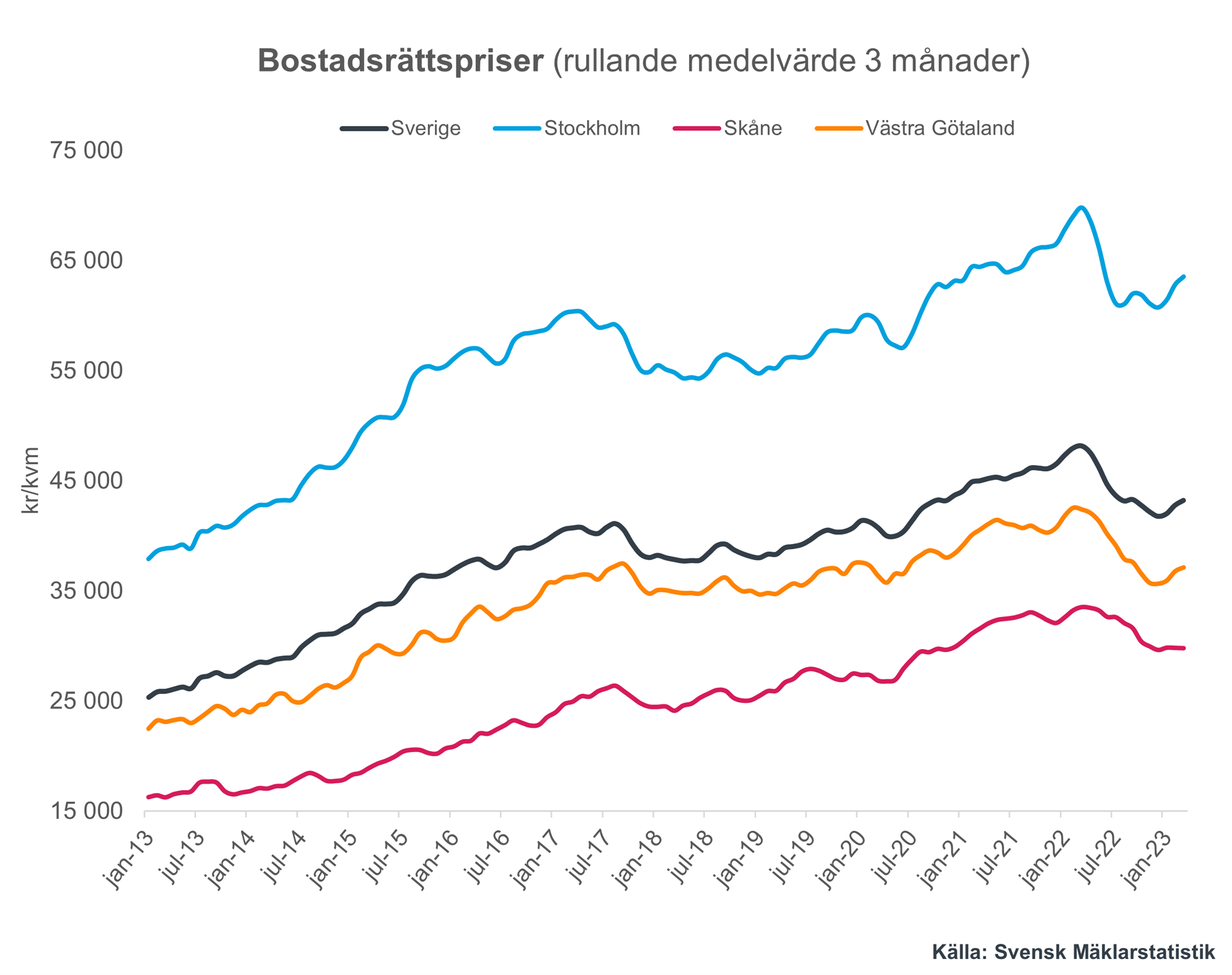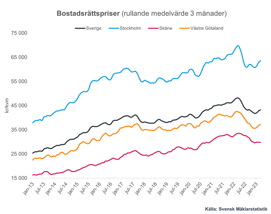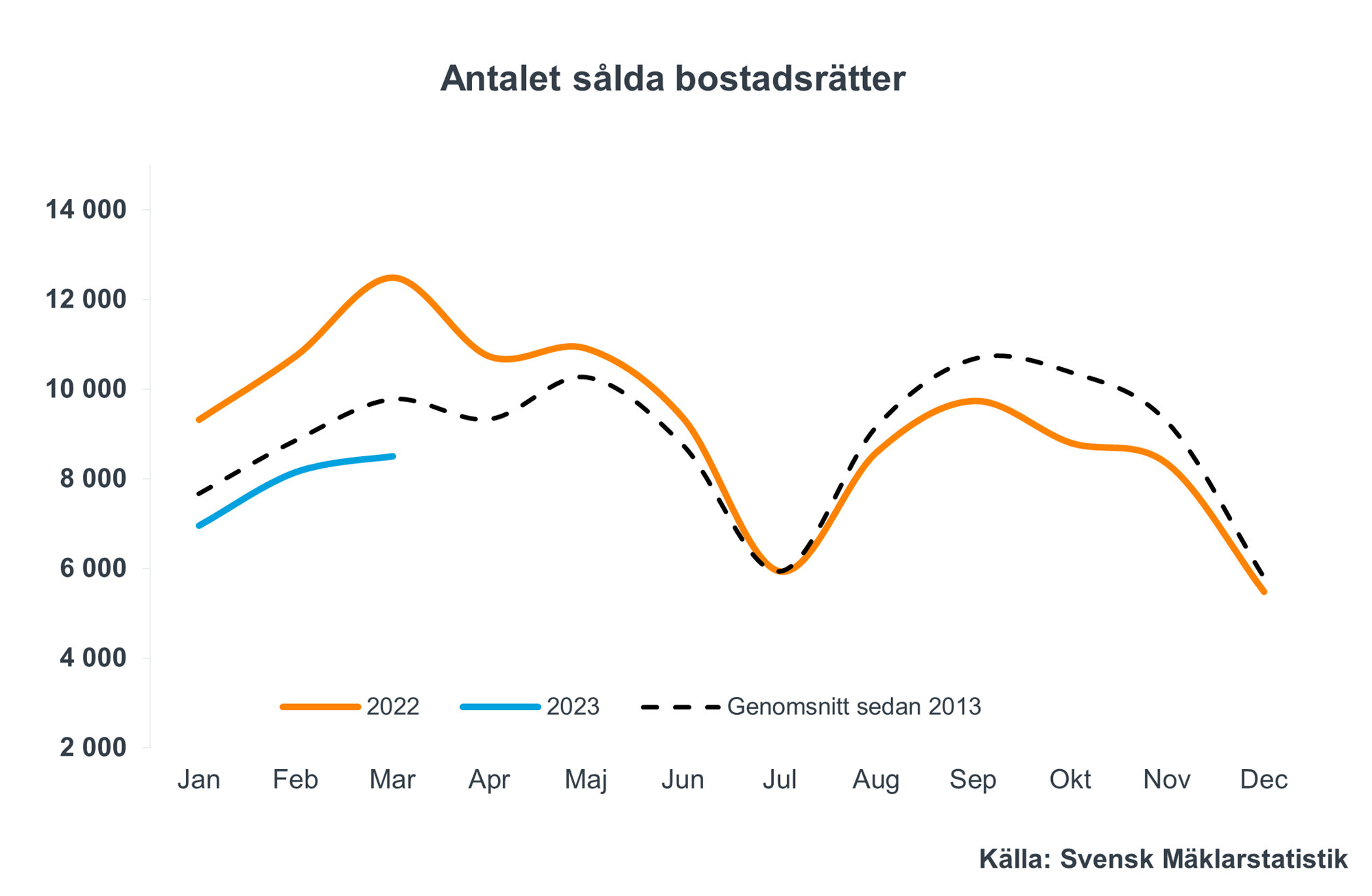 Under mars månad genomfördes totalt 8 500 bostadsrättsförsäljningar i landet, vilket är en nedgång på omkring 32 procent vid jämförelse med i fjol. Däremot så ökade de med omkring 4 procent jämfört med föregående månad. Den historiska nivån för mars månad sedan 2013 ligger i genomsnitt på 9 800 omsatta bostäder.