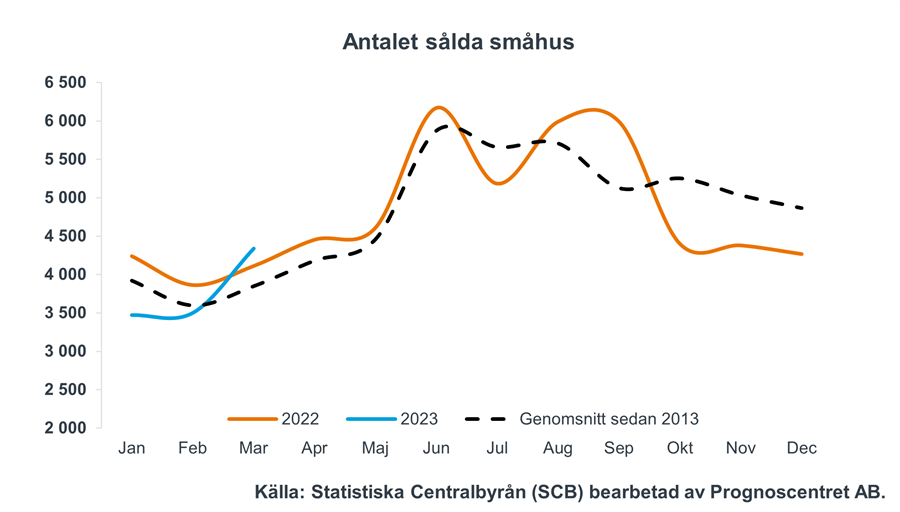 Småhusförsäljningarna i landet uppgick i mars till drygt 4 300, en ökning om 5 procent jämfört med samma månad 2022 och en ökning om 24 procent jämfört med februari.